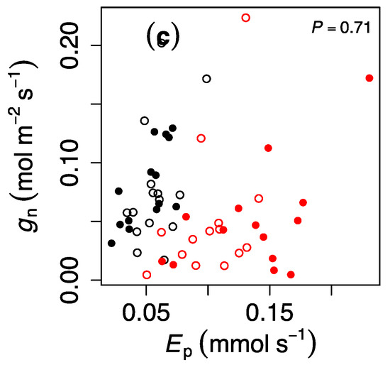 Relationship between nocturnal stomatal conductance (gn) and (a) daytime stomatal conductance (gd,), (b) net assimilation (Anet,), and (c) whole plant transpiration (Ep). Black and red values indicate ambient temperature and heat wave, respectively, and open and closed symbols indicate ambient and elevated CO2 concentrations, respectively. P-values indicate the result of least-squares fitting. Each value represents a single genotype.