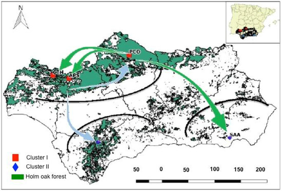 Map of Andalusia (inset showing position of Andalusia in Spain) showing the distribution of holm oak forest and sampling locations (see Table 1 for population codes). Blue arrows indicate inferred seed dispersal events on basis of chloroplast DNA; green arrows show significant recent directional gene flow (see text). Black curved lines partition populations following Barrier analyses.