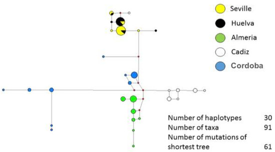 We detected a total of 30 distinct haplotypes among the five regional populations (Figure 2). The total number of mutational steps among the haplotypes inferred from the shortest trees was 61, with most individuals from the same population clustering together with few mutational steps, with the exception of Córdoba. The greatest number of haplotypes [9] was found at Córdoba, whereas we detected only five haplotypes each at Seville and Huelva, three of which were shared in the two populations (Figure 2). Other than the sharing between Seville and Huelva, the remaining populations comprised unique sets of haplotypes. The shared haplotypes at Seville and Huelva suggest recent seed dispersal between the two populations that could be bidirectional. However, interestingly, two individuals (one each from Cádiz and Córdoba) clustered with the Huelva/Seville group (one mutational step for the Cádiz individual and five mutational steps for the Córdoba individual), suggesting unidirectional historical seed dispersal from Huelva/Seville. The number of inferred mutational steps among individuals within populations averaged 7 each at Cádiz (excluding the one individual that clustered with Huelva/Seville) and Almería, 14 in the combined Huelva/Seville cluster, and 21 at Córdoba. Seven mutated positions were inferred between the Huelva/Seville cluster and the closest Córdoba chlorotype (excluding the one individual that clustered with Huelva/Seville), whereas three and four mutated positions were inferred between Córdoba and the nearest haplotypes from Almería and Seville, respectively.