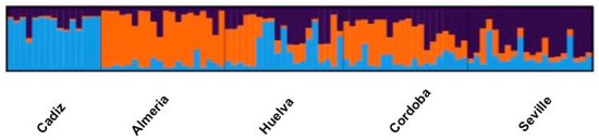 Plot of STRUCTURE results with K = 3 of Q. ilex populations from Andalusia.