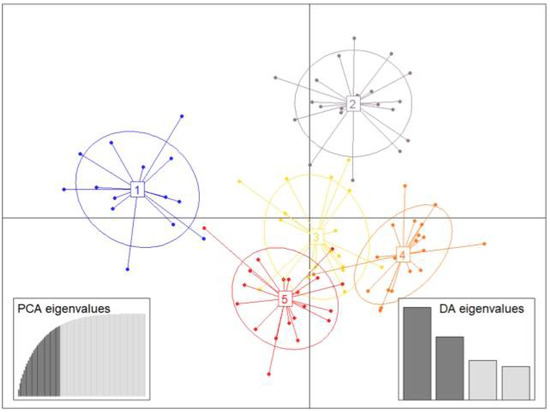 Discriminant analysis of principal components (DAPC) plot of five populations of Q. ilex from Andalusia (1—Cádiz; 2—Almería; 3—Huelva; 4—Córdoba; 5—Seville) on basis of 30 principal component analysis (PCA) components and 4 discriminant analysis (DA) axes.