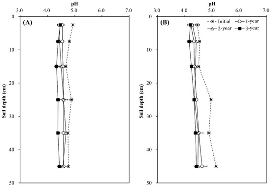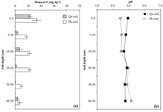 With time, compared with the control soils, the pH in both N-treated soils decreased throughout the soil profile, with greater decreases in the Pk soil than in the Qa soil (Figure 2). In general, it is known that the decrease in soil pH in forest stands correlates well with the production of H+ during nitrification [36,37]; however, NO3–N contents were maintained at higher levels in the Qa soil than in the Pk soil (Figure 3A-b,B-b), unlike the previous investigations in which the rates of nitrification in coniferous tree stands were faster than in deciduous tree stands [38]. However, greater decreases in pH in the Pk soil than in the Qa soil could not be explained by nitrification alone. In addition to nitrification, the production of H+ from leaf-litter decomposition may also affect soil acidification, since coniferous litter produces more organic acids than deciduous litter [39].