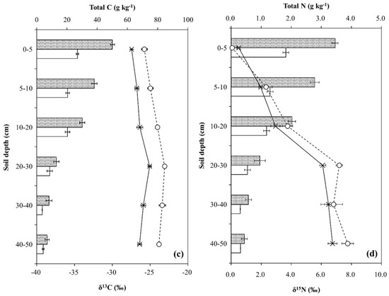 Nevertheless, we could deduce that both δ13C of soil total C and δ15N of total N along the soil profile reflect isotopic fractionation associated with litterfall decomposition and physical mixing processes. Since forest soils are characterized by litterfall and root exudates that are gradually mixed and decomposed down the soil profile [33], more decomposed SOM can exist lower in the soil profile as a result of decomposition and physical mixing, while newer C and N inputs tend to exist shallower in the soil profile [34]. It is well known that microbial enzymes discriminate against 13C and 15N during SOM decomposition, resulting in the significant enrichment of 13C and 15N in SOM pools [19,30,31,32,33,34,35]. Therefore, the experimental site well reflected the history of long-term enrichment of 13C and 15N in SOM pools and the current mixing of new SOM substrates into the soil profile (Figure 1b,c).