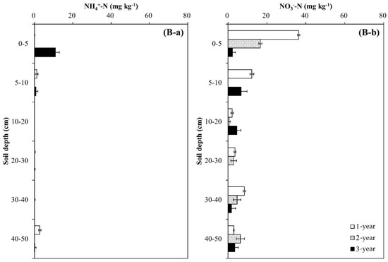 Soil pH decreased during the experimental year and soil depth regardless of tree species, and the decrease was greater in the Pk soil than in the Qa soil (p < 0.05) (Figure 2). In the first-year of the experiment, soil pH at 0–20 cm decreased sharply by 0.29 in the Qa soil and 0.41 in the Pk soil, which were lower than that of control soil throughout the experiment (p < 0.001). At the end, compared with the control soil, the pH of N-treated soils decreased by 0.3 and 0.3 in the upper layers of the Qa and Pk soils, and by 0.3 and 0.6 in the lower layers (30–50 cm) of the Qa and Pk soils, respectively. Prior to N treatment, mineral N (NH4+–N and NO3–N) contents were higher in the Pk soil than in the Qa soil, and this pattern was maintained throughout the experiment (Figure 3). However, the levels of NH4+–N at a soil depth of 0–5 cm in N-treated soils were not different during the first two years, but increased during the third year (p < 0.05) (Figure 3A-a,B-a), while those of NO3–N increased in the Qa soil and decreased in the Pk soil throughout the experiment (p < 0.05) (Figure 3A-b,B-b).