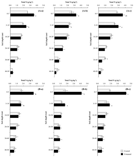 Figure 4. Annual variations in total N after (a) one year, (b) two years, and (c) three years of N deposition in two different (A) oak (Qa) and (B) pine (Pk) forest floor soils. For each N profile, different lowercase letters indicate a significant difference (p < 0.05). Error bars indicate ± one standard deviation (n = 3).