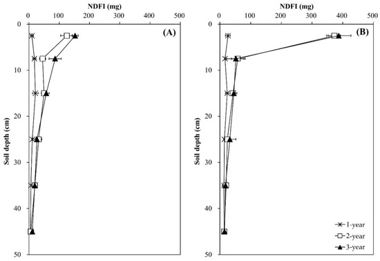 Our results of annual distribution patterns of NO3 (Figure 3A-b,B-b) were consistent with the above-mentioned results of previous studies of NO3 leaching through the soil profile, and this pattern of NO3 transported by leaching was well corroborated by the NDFI profiles (Figure 4) in which N treated on the soil surface of the forest floor was transported down to the bottom of the profile column during the first year. However, during the following two years, a greater portion of N was recovered in the upper surface layer in both soils, indicating the incorporation of urea-N into the formation of SOM and/or microbial mass.