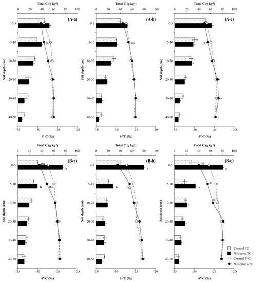 However, soil total C contents were not different between both N-treated soils and the control soils below a soil depth of 10 cm, and this pattern indicated that new C substrates from litter decomposition did not penetrate into the soil profile below this soil depth (10 cm) over the three years, since NO3 ions migrate much faster than organic C particles through the soil profile [49]. The increasing patterns of δ13C from the surface to this soil depth obviously reflected the physical mixing of new C substrates with old C substrates while migrating down the profile (Figure 6), even though the decomposition of SOC pools leaves behind the heavier 13C substrates in the soil. Since forest soils are characterized by litterfall and SOM pools that are gradually mixed and degraded down the soil profile, more recalcitrant substrates (such as lignin, fat, and wax) are in deeper soil layers [2,47]. It is a common notion that N treatment causes an increase in SOC contents through increased soil microbial activity [35,38,49]. However, our results invariably indicated that the decomposition of old SOC pools is very limited in deeper soil layers where the chemical and biological activities are limited.