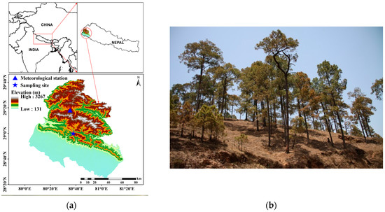 The study site was located in the mid-hills of far western Nepal, the junction of the western and the central Himalayas. It is located in the Kailali district (80°59′–80°62′ E and 28°96′–29°93′ N) in the Himalayan subtropical zone. The elevation of the sampled Chir pine (Pinus roxburghii) forest ranges from 1680 to 1710 m a.s.l. (Figure 1).