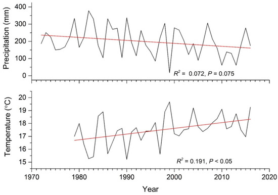 Time series of spring (March to May) precipitation (1972–2016) and temperature (1978–2016) from the Dadeldhura meteorological station. Spring temperature showed a significantly increasing trend, and spring precipitation showed a decreasing trend, but not significant.