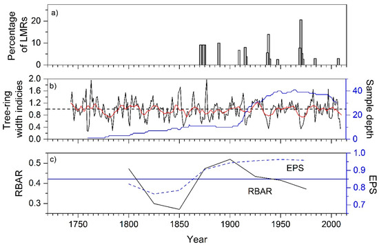(a) Percentage of locally missing rings (LMRs) over the well-replicated period (1875–2010); (b) Tree-ring width chronology of Chir pine from Kailali, western Nepal Himalayas, with the 10-year moving average curve (solid red line), sample depth (the blue line shows the number of sampled trees or sample depth); (c) variation of mean series inter-correlation (RBAR) and Expressed Population Signal (EPS, dashed blue line) over time (the horizontal blue line represents the EPS threshold (i.e., 0.85) often used to demonstrate well-replicated chronologies). RBAR and EPS were calculated using 50-year moving windows with a 25-year overlap.