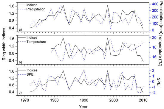 Comparison between ring-width indices of Chir pine and March-April precipitation (1972–2010) (a), temperature (1978–2010) (b) from meteorological records at Dadeldhura, and March Standardized Precipitation Evapotranspiration Index (SPEI) calculated at 5-month-long intervals (1972–2010) (c).