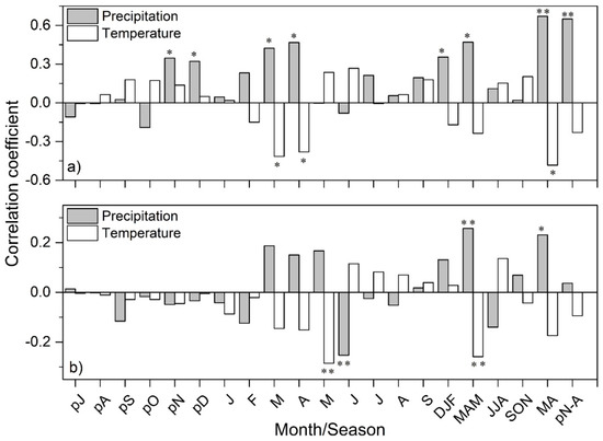 Pearson correlation coefficients calculated between ring-width indices and the mean of monthly, seasonal temperatures, and sum of monthly and seasonal precipitation from previous-year July (pJ) to current-year September (S), previous-year November to current year April (pN-A) based on climatic data from the meteorological records at Dadeldhura (a), Climate Research Unit (CRU) grid (29–29.5° N, 80.5–81° E) (b), and the Chir pine ring-width chronology from western Nepal. Significance levels: * p < 0.05 and ** p < 0.001. DJF: December to February; MAM: March to May; JJA: June to August; SON: September to November; MA: March to April.