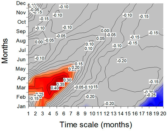 Fields of highest Pearson correlation coefficients calculated between monthly values of the Standardized Precipitation Evapotranspiration Index (SPEI) (1972–2010) and the Chir pine ring-width chronology. Correlations above 0.25 and below −0.25 (shown as color-filled contours) are significant at the 0.05 level. SPEI values were calculated for 1- to 20-month-long intervals (X axis).