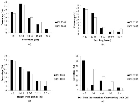 Scar distribution percentage as related to (a) width and (b) length, (c) height from ground, and (d) distance from centerline of forwarding trail for each unit.