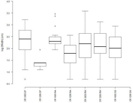 Except for evaluating scar width between units and species, we analyzed each unit (CR 1200 and CR 1003) separately because of several reasons: (1) CR 1200 was winter harvested and CR 1003 was summer harvested; (2) each unit had unique stand structure and species composition; (3) tree DBH differed between units; (4) different equipment and operators were used in each unit; and (5) CR 1200 was flat, and CR 1003 had a slope ranging from 0–27%. All of these factors can lead to different conclusions if the stands were combined for all analyses. For example, Limbeck-Lilienau [20] noted that there was more severe scar damage to residual trees (20–21%) on steep slope units as compared to only 3–6% of residual trees on flat ground.