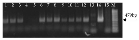 Presence of mitovirus confirmed by gel electrophoresis. Lanes 1–3, 6–13 positive samples; Lanes 4–5 negative samples; Lane 14, positive control; Lane 15, negative control (water and PCR mix), M, marker (GeneRuler 100 bp DNA Ladder).