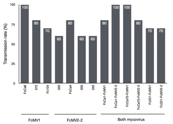 The transmission rates of viral strains recorded in our study were high in most of the isolates. A high rate of transmission was expected, as mitoviruses FcMV1 and FcMV2-2 are associated with the mitochondria that the offspring inherit from the parents []. The high transmission rates of mycoviruses are consistent with those reported for asexual spores of other fungal species such as Ustilaginoidea virens [] and Epichloë festucae [] whereas for other pathogens variable rates of virus transmission were observed, e.g., Heterobasidion annosum [] and CHV1 hypovirus infecting Chryphonectria parasitica [,,]. In some species, usually ascomycetes, there appear to be barriers to the transmission of viruses during sexual reproduction and the formation of sexual spores []. While no virus-transmission was observed via sexual spores in C. parasitica [] and of the root rot pathogens Helicobasidium mompa and Rosellinia necatrix [], wide-ranging rates of transmission were reported for H. annosum, [], H. parviporum [], and Lentinula edodes []. The lack of repetition of the experiment limit us to draw conclusions about the variance and reproducibility of our methodology and to estimate standard errors on the transmission rate. Experiments of less replicates made at different points of time are recommended for future studies to gain more statistical representation.