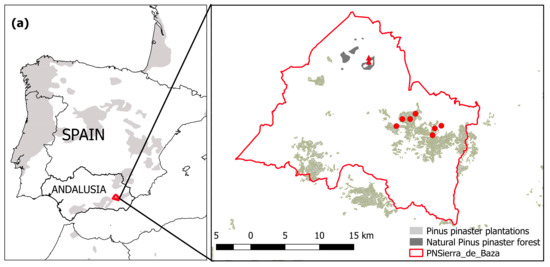We included data from two types of forests located in Sierra de Baza (Granada, southeastern Spain): naturally regenerated forests (hereafter abbreviated as F stands, 37°24′44″ N; 2°49′18″ W, 1380 m a.s.l.), and planted forests (hereafter abbreviated as P stands, 37°20′28″ N; 2°45′38″ W, 1340 m a.s.l.; see Figure 1; Table 1).