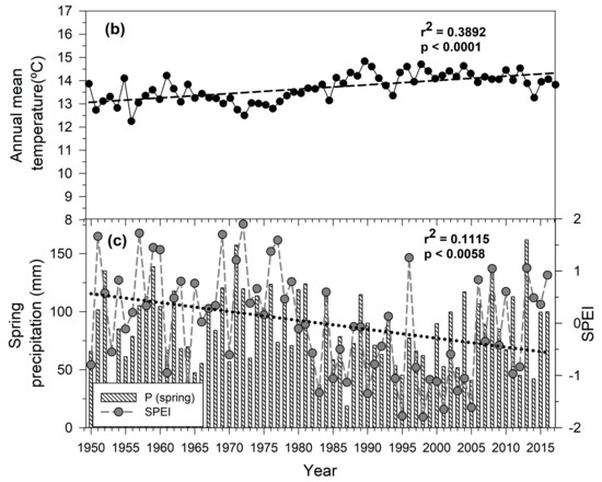 We found a significant increase in annual mean temperature during the 20th century (Figure 1a), with a “break point” around 1978 after which warming accelerated when compared with previous decades. A significant reduction in annual precipitation was observed with a strong variability between decades and years and wet periods (1950s, 1970s) alternating with dry decades (1980s, 1990s, 2000s). After the 1980s, spring annual precipitation decreased rapidly (Figure 1a). Additionally, a long-term trend was detected in the SPEI index with increasing aridity during the second half of the 20th century as compared with the first half (Figure 1b).