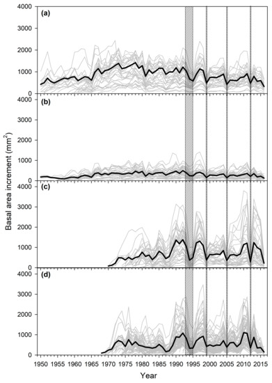 Figure 2. Basal area increments of non-declining ((a,c)) and declining ((b,d)) Pinus pinaster trees sampled in naturally regenerated forests ((a,b)) or plantations ((c,d)). The grey and black lines show individual and mean values, respectively. The vertical dashed lines correspond to the 1990–1995, 1999, 2005 and 2012 droughts (see Figure 1b).