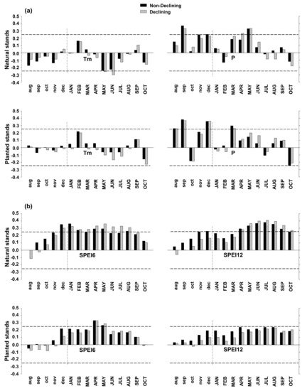 Figure 3. Pearson correlation coefficients obtained by comparing radial growth (ring-width indices) and monthly climatic data (a), Tm: mean temperature; P: precipitation) (b) drought SPEI index, SPEI 6 and SPEI12 correspond to the SPEI calculated at 6- and 12-month-long scales, respectively) for non-declining (black bars) and declining (gray bars) Pinus pinaster individuals from naturally regenerated (upper plots) and planted stands (lower plots). Monthly climatic variables from the previous and current years are abbreviated by lower and upper-case letters, respectively. Dashed lines are significant values (p < 0.05). Correlations were calculated for the common period 1975–2016.