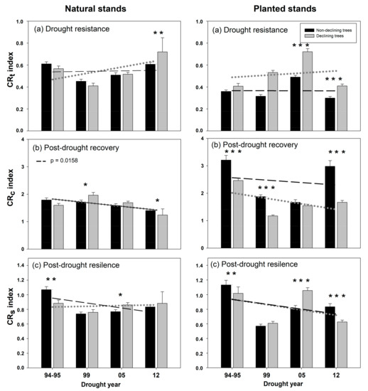Figure 4. (a) Resistance (CRT), (b) resilience (CRC), and (c) recovery (CS) growth indices calculated for non-declining (ND trees, black bars) and declining (D trees, gray bars) Pinus pinaster trees in naturally regenerated (left column) and planted (right column) stands, considering four droughts (1994–1995, 1999, 2005 and 2012). Dashed and dotted lines indicate trends, considering all droughts (x axes) for ND and D trees, respectively. Asterisks indicate significant differences between ND and D trees based on Student’s t test, *** p < 0.0001; ** p < 0.001; * p < 0.01 level. The displayed statistics (P) refer to significant (p < 0.05) trends. Values are means ± SD. See Table 3.
