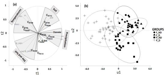 Figure 5. Weights plot of Partial Least-Squares regression (PLS). (a) Pearson correlation coefficients (r). Black lines correspond to response variables (resilience indices calculated for the 1995, 1999, 2005 and 2012 droughts) and light gray lines correspond to predictors; (b) Scores of each case in the projected observation matrix (T). Predictors (abbreviation): winter precipitation (pin), autumn precipitation (po), percent base saturation (psb), evapotranspiration (eto), maximum temperature of warmest month (tmaxc), annual radiation (rn), water retention capacity (crad), aspect (t_expo), slope (t_pend), and active limestone (ca). See Table 1 for the stand descriptions and Table S1 (Supplementary Material) for the variables’ abbreviations.