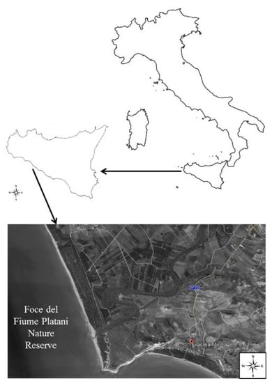 Field surveys were carried out within the nature reserve “Foce del fiume Platani”, a 3.5 km long coastal belt consisting of 207 hectares, localized in the Agrigento Province (SW Sicily, Figure 1). Average annual precipitation is 496.7 mm, while the average annual temperature is 18.7 °C (Osservatorio delle Acque, 2016). Hence, the study area falls within the Thermomediterranean upper dry bioclimatic belt []. The dominant soil types in the study area are Typic Xeropsamments entisoils, with a sandy texture in the first meter of soil depth []. The reserve includes the alluvial plain originated by the delta of the Platani River. This coastal strip has not been affected by marked anthropic alterations and still hosts residual aspects of coastal dune and Mediterranean maquis vegetation, with high potential biodiversity, linked to the presence of the sea, coastal dunes, and backdune habitats. The woody vegetation is characterized by the coexistence of Mediterranean native species, such as Ephedra fragilis Desf., Pistacia lentiscus L., Chamaerops humilis L., and Olea europaea var. sylvestris, with planted alien tree species, especially Pinus spp., Acacia saligna and Eucalyptus camaldulensis Dehnh., and alien shrub species like Myoporum tenuifolium G.Forster []. The study area also harbours plant species of particular conservation value, such as Retama raetam subsp. gussonei and Juniperus turbinata Guss., characteristic of the association Ephedro-Juniperetum macrocarpae Bartolo, Brullo & Marcenò 1982 [].
