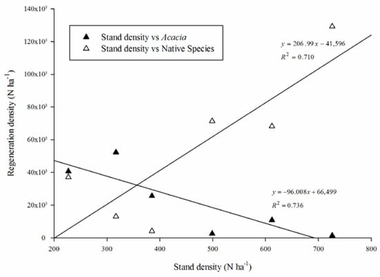 Linear regression analysis between the pine stand density and the native woody species and Acacia saligna regeneration.