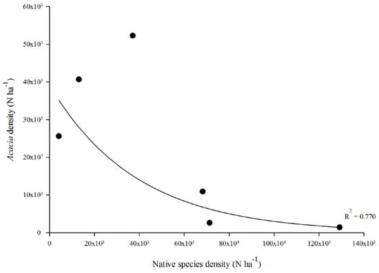 A strong negative exponential relationship (r2 = 0.770) was found between the regeneration density of the native woody species and A. saligna (Figure 3).