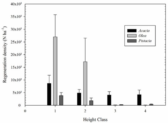 No significant differences between the height classes were found in A. saligna Labill. regenerating individuals (F = 0.975, p = 0.414) (Figure 4). In Olea, height classes 1 and 2 were not different from each other and both were significantly higher than height classes 3 and 4 which, in turn, were equal with each other (F = 16.498, p < 0.001) (Figure 4). In Pistacia, height class 1 was significantly higher than the other height classes. Height class 2 was significantly higher than height classes 3 and 4 which, in turn, were equal with each other (Kruskal-Wallis 22.971, p < 0.001).