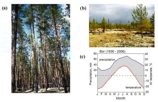 The mean annual air temperature of the area (as measured at the nearest weather station of Bor (61°45′ N, 91°13′ E) for the period 1936–2006 is −3.7 °C, with July being the warmest month (+17.3 °C) and January the coldest (−22.9 °C). The period with daily temperature above +5 °C typically lasts for 147 days and mean daily temperate for this period is +11.5 °C [32,34]. Annual precipitation averages 493 mm, with 70% falling in summer [32]. According to the climate analysis of [35], the site has a positive hydrological balance (Figure 1c).