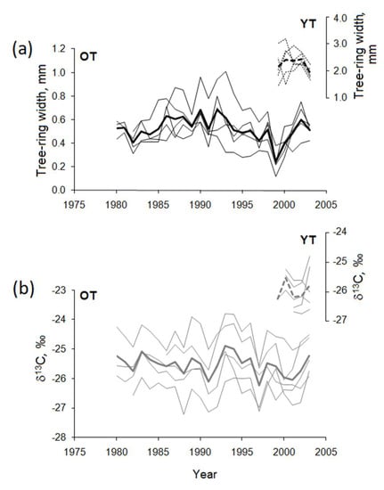 Tree-ring width and average annual δ13С covered differing period lengths (period 1980–2003 for old trees and 1999–2003 for young trees, Figure 2).