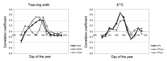 Growth responses to the climate were evaluated by calculating Pearson correlations between tree-ring width and δ13С chronologies and the monthly temperature and precipitation from the Bor meteorological station for the period from 1980 to 2003 for OT-site. Analysis was performed for each month, from May of the previous year to September of the current year. Since the growing season for northern territories lasts for about four months, it was necessary to take into account the effect of short-term weather conditions [47,48]. Pearson’s correlations of tree-ring width and δ13С with climatic parameters were calculated for a 20-days window, with 10-days step moving along the period 1980–2003.