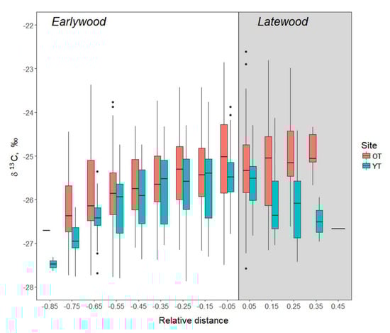 Intra-annual δ13C distribution within tree rings of old (OT) and young (YT) trees, aligned to the earlywood-latewood transition (i.e., negative values—earlywood, positive values-latewood). The relative distance from the transition has been calculated has the departure from the earlywood-latewood transition to allow comparisons between ring of different size.