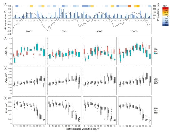 The intra-seasonal curves of δ13С, cell-wall, and lumen area for the rings 2000 to 2003 of each group are summarized in Figure 5. The climatic years of the selected rings are characterized by contrasting conditions, with a wet 2001 and dry 2003 growing season. Unexpectedly, the number of cells produced during the wet year was higher than in the dry year in the YT only (74 cells in 2001 and 63 cells in 2003), while there was an increase in OT (from 15 to 19 cells).