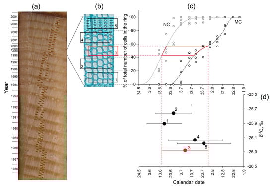 Time assignment of intra-annual δ13С measurements. (a) Image of a Pinus sylvestris L. core (tree number 5, OT) used for δ13С measurement. The series of vertical marks spaced by 100 μm and with a shift of 50 μm shown on the wood cross-section of the core shows the position of the 80 μm width laser shots used for δ13С measurement; (b) Image of a micro-section of the tree ring formed in 2000. Rectangle indicates the laser shoot position within tree ring; (c) Curves of the total non-mature (NC) and mature (MC) number of cells counted during the 2000 growing season. Lines indicate a fifth-order polynomial fitting. The horizontal distance between the two curves indicates the time spent by each cell in the enlarging and wall thickening phase; (d) Plot of the measured δ13С aligned along a temporal axis corresponding to the time of formation of the ring sector used for isotopes measurements, as derived according to the description above.