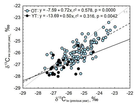 Comparisons of δ13С values between previous latewood and given year earlywood δ13С of bordering rings showed the existence of a significant correlation between the first earlywood cells in a given year (t), and the last latewood tracheids formed in the preceding year (t − 1). The R2 and the slope are higher for OT (R2 = 0.578 and slope = −7.59) than for YT (R2 = 0.316 and slope = −13.6) (Figure 7).