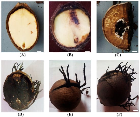 Symptoms of Xylaria karyophthora on Chlorocardium spp. (Lauraceae) seeds from Guyana. (A) Healthy seed; (B,C) Early stages of infection; (D–F) Stromata of Xylaria on Greenheart seeds. Bar = 10 mm.