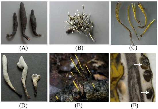 Teleomorphic stromata of various Xylaria species in Guyana. (A) Common black carbonaceous morphology of Xylaria sp.; (B–E) Other morphologically distinct forms of Xylaria; (F) Section through stromata exposing perithecia (arrows).