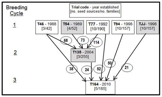 Development of three successive cycles of Eucalyptus urophylla S.T.Blake breeding in China. Trials shaded in grey were not sampled for this study; circled numbers indicate number of families contributing to the succeeding trial indicated by the associated arrow.