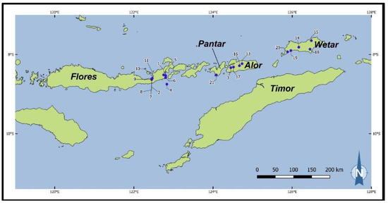 Geographic locations of E. urophylla natural stand provenances in Indonesia from which the genetic material included in the trials of the first cycle breeding population originated—the numbers linked to blue dots indicate the locations of the numbered provenances listed in Table 1.