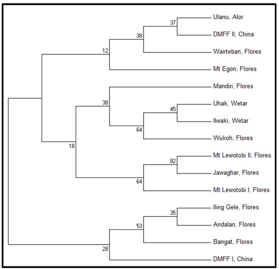 Relationships between the 15 provenances from the first cycle population (that had 5 or more families sampled for this study) are summarized in an unrooted neighbor-joining dendrogram, which is based on Nei’s genetic distance estimates, as shown in Figure 3. While the dendrogram generally does not show a strong connection to provenance geographic origins, it must be noted that many clusters and nodes identified in this are poorly supported (i.e. bootstrap values <50—see [36]). On account of this there can be little confidence in the patterns and genetic associations observed in the dendrogram. Of the two seed sources originating from previous trials (of exotic genetic material), DMFF I was closest to the provenances of Anadalan, Bangat and Iling Gele from the island of Flores, whilst DMFF II was closest to the provenance Ulanu from Alor Island, but these associations are dubious and uncertain on account of low bootstrap values associated with their branches.