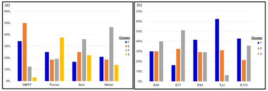 Whilst the 12 clusters indicated by the initial analysis showed no discernible associations with geographic origins, the subsequently indicated 4 clusters aligned somewhat weakly with geographic provenance origins (Figure 4a). Individuals originating from earlier trials in China (i.e., DMFF I and DMFF II) were predominantly allocated to cluster 2, individuals from Flores Island were predominantly allocated to cluster 4 and those from Alor and Wetar were predominantly allocated to cluster 3. The members of cluster 1 were mixed, with only 34% or less of individuals originating from any particular island/seed source being allocated to this cluster. However, it must be noted that some individuals might have been assigned to the wrong cluster, as Fst needs to be over 0.05 to achieve an assignment accuracy of 95% or more [37]; in the present study, the average of Fst across all relevant pair wise provenance comparisons was 0.044.