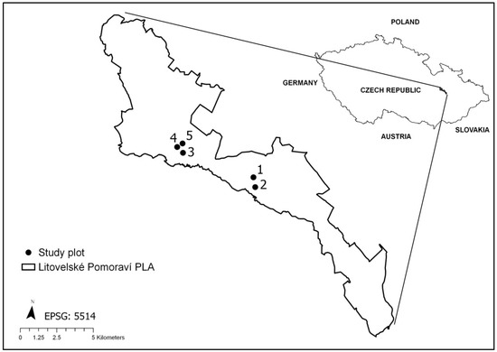 In the study area, we established five study plots (100 × 100 m) to be used for field data collection (Figure 1). Such plots are considered suitable for characterizing local forest bird communities in ecological studies of Central European forest birds [26,27].