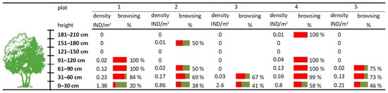 The negative effect of browsing on shrub species can be intensified by their occurrence in herb layers, as browsers often prefer plant species occurring close to the forest floor [62,63]. The observed extreme browsing pressure was most likely the main factor leading to the absence or reduction of the shrub layer.