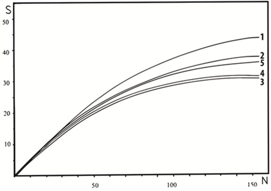 Standardized rarefaction curves for species richness in study plots (S = number of bird species, N = number of nesting pairs, 1–5 = rarefaction curves for study plots no. 1–5).