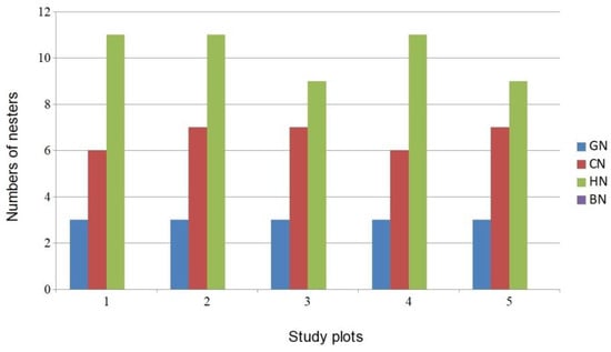 Structure of bird nesting guilds in study plots. (GN—ground nesters, CN—canopy nesters, HN—hole nesters, BN—bush nesters).