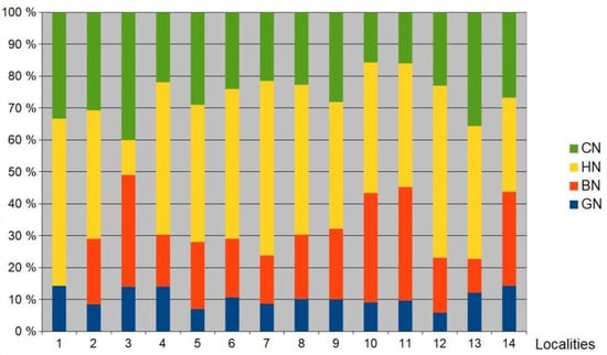 Comparison of guild structures in bird communities in the hardwood floodplain forests in the Czech Republic. (GN—ground nesters, CN—canopy nesters, HN—hole nesters, BN—bush nesters). Localities: 1 = average data from LPPLA, 2 = [41], 3 = [42], 4 = [44], 5 = [45], 6 = [46] Bosin, 7 = [46] Dubno, 8 = [46] Choltice, 9 = [46] Zbytka, 10 = [48] Sargoun, 11 = [48] Vrapac, 12 = [49], 13 = [49], 14 = [54]).