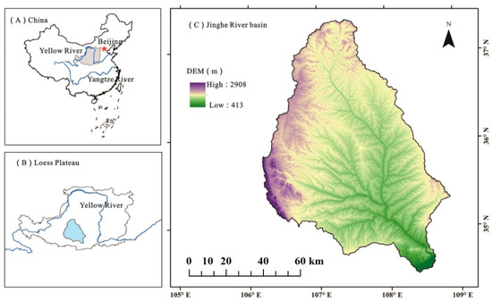 The Jinghe River basin is located in the southwest of the Loess Plateau and covers an area of 70,040 km2 (Figure 1). The basin is in the transitional zone between the temperate semi-humid and temperate semi-arid and has a typical temperate continental climate. The temperature and precipitation in the Jinghe River basin decrease gradually from southeast to northwest. The annual average temperature and average annual precipitation in the region are approximately 10 °C and 290–560 mm, respectively. The primary vegetation types in this area are forest, shrub, and grassland (Table 1) [47]. In the past decade, high-intensity human activities in the basin have led to an increasing trend in soil erosion and decreasing trend in vegetation coverage [45]. Thus, to improve the ecological environment, the local government has implemented a series of ecological programs, such as the Grain for Green Program (GGP). However, the continuous population growth and rapidly expanding towns continue to exert considerable pressure on the natural environment [46]. Therefore, this study focused on the Jinghe River basin as the study area to analyze changes in vegetation dynamics and distinguish the effects of climate change and human activities. The results of this research are of great scientific significance in understanding the rules of regional vegetation changes, as well as summarizing and improving ecological restoration measures.